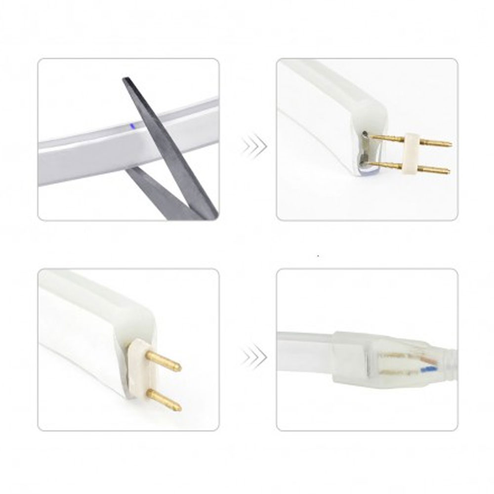 Do prawidłowego podłączenia taśmy należy znaleźć miejsce przecięcia (oznaczone na niebiesko), a następnie wcisnąć kolektor. Tą czynność należy powtórzyć od strony przewodu zasilającego. Dla dodatkowej ochrony łączenia można zabezpieczyć rurką termokurczliwą lub silikonem – nie jest to konieczne.